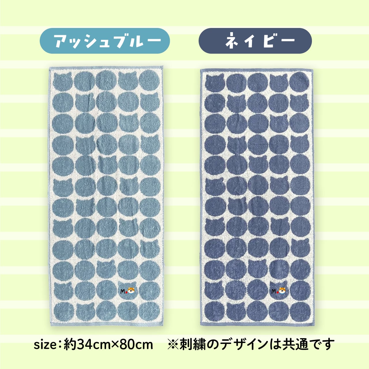 立ち耳のわんこかな?にゃんこかな?なドット柄がかわいいフェイスタオルに、Mドットシリーズのにっこりまる刺繍を施しました。