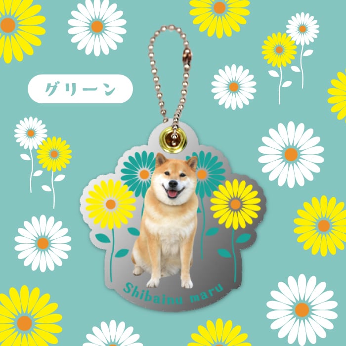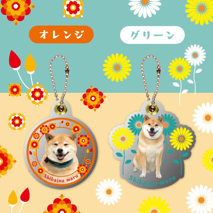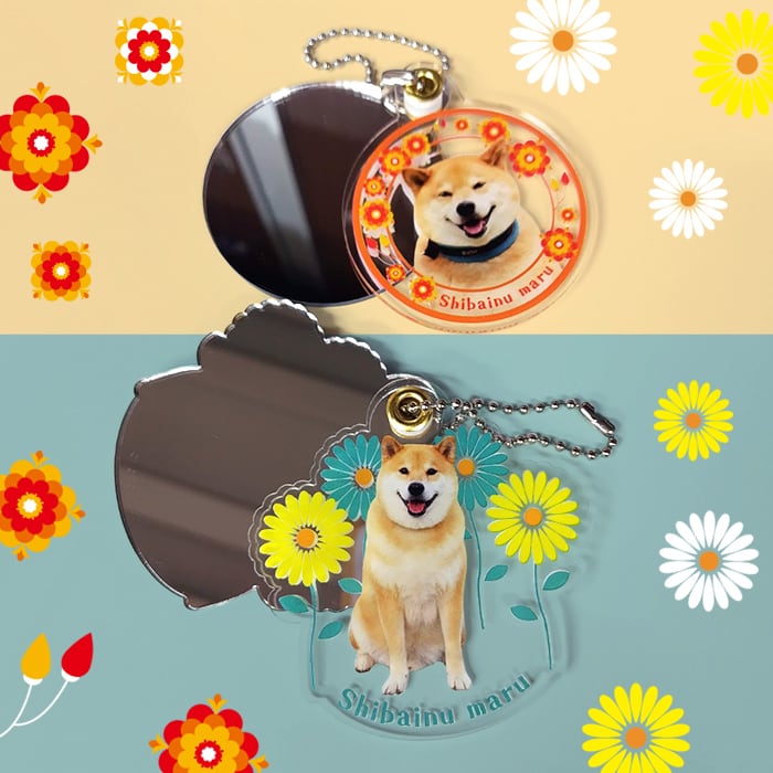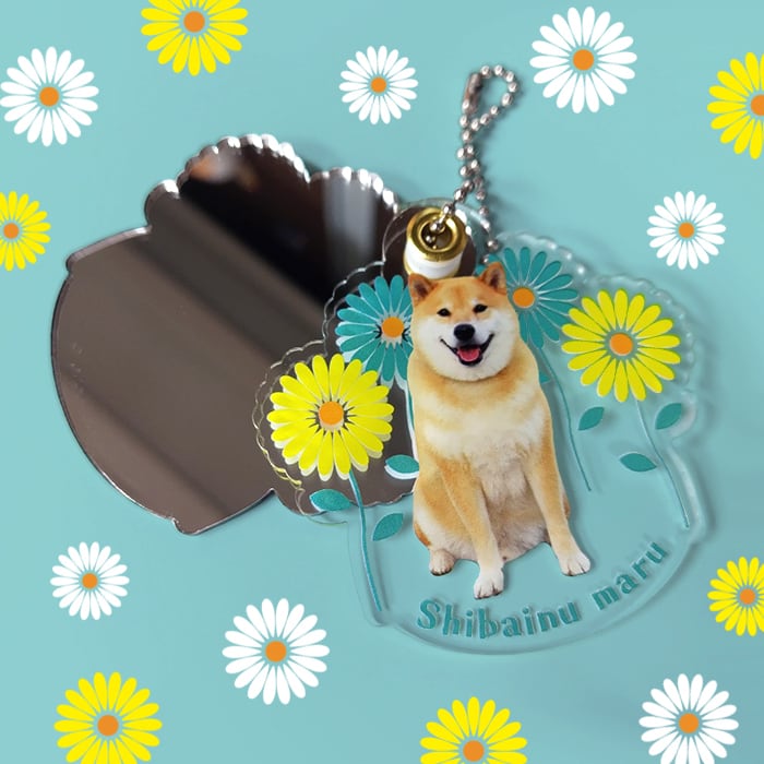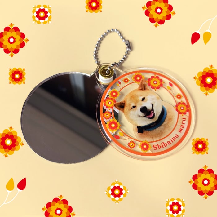 透明なアクリルにかわゆいまるの写真とちょっぴりレトロな雰囲気のお花のイラストが描かれたスライドミラーです!